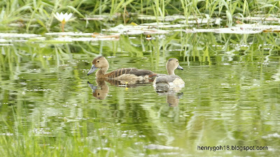 During the trip to the Ox-Bow lake near Sg. Mati a total of 5 Lesser Whistling Ducks was sighted. Two of them were seen flying around the lake and the other three were quite contented just wading and enjoying the cool waters whilst at the same foraging. The numbers have reduced from the 9 birds sighted during the first visit. Wondering if trapping them for food by local villagers ignorant that these are 'wild' ducks is the cause for the reduced numbers. :-(